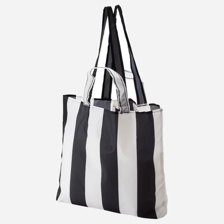کیف دستی سفید مشکی ایکیا IKEA-SKYNKE مناسب نگهداری لباس ها، حمل خرید ها و ... است. این کیف به راحتی جمع میشود. پس در مواقعی که نیازی به آن ندارید میتوانید تا کنید و داخل کمد قرار دهید. این سبد از پارچه پلی استر ساخته شده که بسیار بادوام و مناسب محیط های مرطوب است.