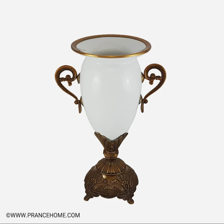 “گلدان پیوتر سرامیک کوچک یونیک کد 1510” ساخته شده از سرامیک و دارای لعابی سفید در پس زمینه است. این لعاب سفید رنگ به وسیله یک لعاب طلایی درخشان در لبه تزیین شده تا هر چه زیباتر بدرخشد. جنس سرامیکی این ظرف باعث شده تا نسبت به ظروف چینی معمولی سبک تر باشد اما استحکام خود را حفظ کند. پایه و دسته های این گلدان از جنس پیوتر با نقوش و طرح های زیبا که حالتی کلاسیک به ظرف می بخشد. آلیاژ پیوتر که به نام مسوار هم شناخته میشود ترکیبی است از مس و قلع و رنگی بین زرد و مسی دارد. از این رو بسیاری از وسایل خانگی و تزیینی از این آلیاژ ساخته می شود. از دیگر ویژگی های مهم این آلیاژ ضد زنگ بودن آن است.برای دیدن انواع ظروف پیوتر در فروشگاه پرنس هوم بر روی کلمه ی “ پیوتر ” کلیک کنید.