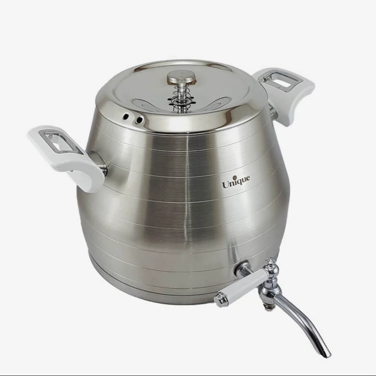 بدنه این کتری کاملا از استیل ضد زنگ و دسته ها نسوز هستند. خروجی آب آن به صورت شیر و ضامن دار میباشد که استفاده از آن را بسیار راحت کرده. در کتری های با حجم بالا داشتن شیر مهم است؛ زیرا برای ریختن آب نیاز به بلند کردن کتری ندارید. با توجه به زیبایی و سادگی این کتری میتواند با هر تم آشپزخانه ای ست شود و انتخاب مناسبی برای جهیزیه هر نو عروسی است.