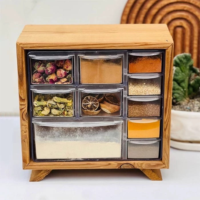 کافیه محفظهها رو با ادویه یا دمنوش دلخواهت پر کنی و هر وقت لازم داشتی، کشوی مربوط بهش رو بیرون بیاری و استفاده کنی. بعد از هر بار مصرف، کشوها رو ببند تا همهچیز تمیز و مرتب بمونه.