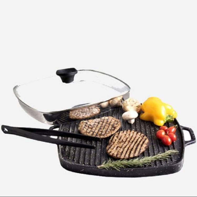 همراه با این تابه گریل یک درب شیشه ای بلند برای پخت بهتر و یک انبر آشپزی پلاستیکی نسوز عرضه میشود.