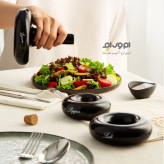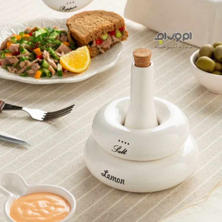 این ست شامل نمک پاش, فلفل یا ادویه پاش و جای آبلیمو یا روغن زیتون هست.