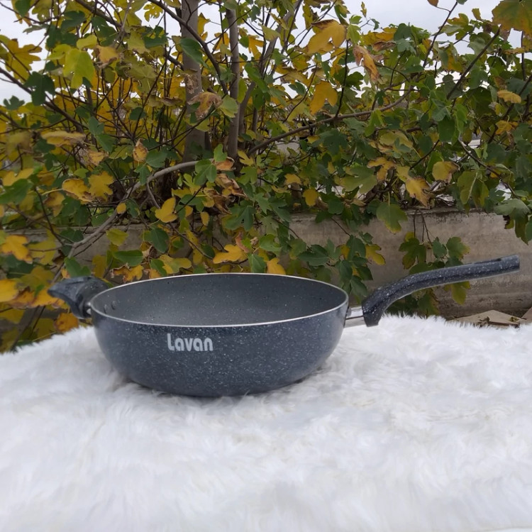 تابه های تک دسته ووک یا عمیق لاوان مدل تیتان طوسی تولید شده با ورق ضخیم آلومینیوم و پوشش داخلی گرانیتی و با دسته ای از جنس باکالیت نسوز می باشد