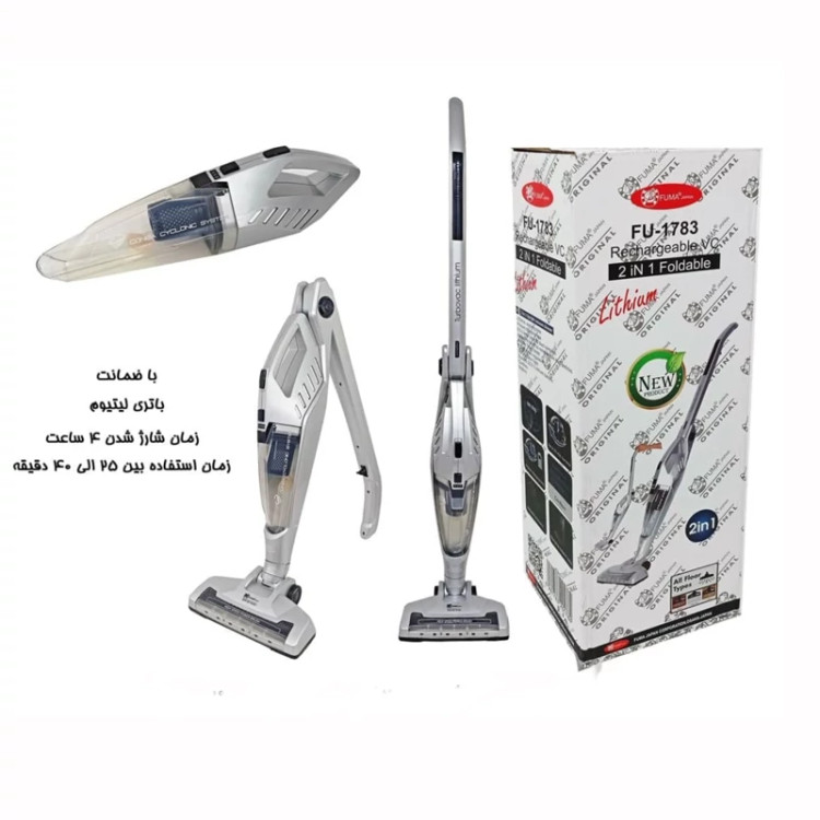 جارو شارژی فوما FU-1783 از سری محصولات جدید و با کیفیت فوما است که با بهره گیری از یک باتری لیتیومی امکان استفاده بی سیم و شارژی را برای شما فراهم می سازد و می توانید در مکانهایی که دسترسی به پریز برق ندارید از آن استفاده کنید. این محصول فوما با طراحی خاصی که دارد این امکان را فراهم آورده که هم به صورت دستی و هم عصایی از آن برای تمیز کردن استفاده کنید. همانطور که گفته شد این جارو به یک باتری لیتیومی مجهز است که دارای ولتاژ 22.2 ولت می باشد و مدت زمان شارژ کامل آن 4 ساعت است و بعد از شارژ شدن کامل می توانید به 25 دقیقه به صورت شارژی از آن استفاده کنید. البته مدت زمان شارژدهی به نوع کارکرد آن بستگی دارد و به این صورت است که عملکرد جارو در صورت استفاده با سرعت بالا 22 دقیقه و با سرعت پایین 40 دقیقه می باشد که با قابلیت تنظیم قدرتی که دارد می توانید توان آن را تنظیم کنید. برای اطلاع شما از میزان شارژ باتری یک چراغ نمایشگر بر روی بدنه دستگاه تعبیه شده تا از کمبود شارژ باتری مطلع شوید و در صورت اتمام آن را به شارژ بزنید. همچنین با همراه داشتن پایه شارژ به آسانی می توانید آن را شارژ کنید. جارو شارژی فوما 1783 از طراحی خاصی برخوردار است و قابلیت استفاده و تمیز کردن قسمت های مختلف را برای شما فراهم می کند و به تنهایی از تمیز کردن تمامی قسمتهای منزل برمی آید. دسته جارو نیز قابلیت جمع شدن را دارد که نگهداری را آسانتر می کند و بعد از پایان کار می توانید آن را جمع کنید. از سری لوازم جانبی که همراه محصول ارائه می شوند شامل پایه شارژ، شارژر، دو سری مختلف و نازلهایی که برای جارو کردن و تمیز کردن قسمت های مختلف می توانید از آنها استفاده کنید.