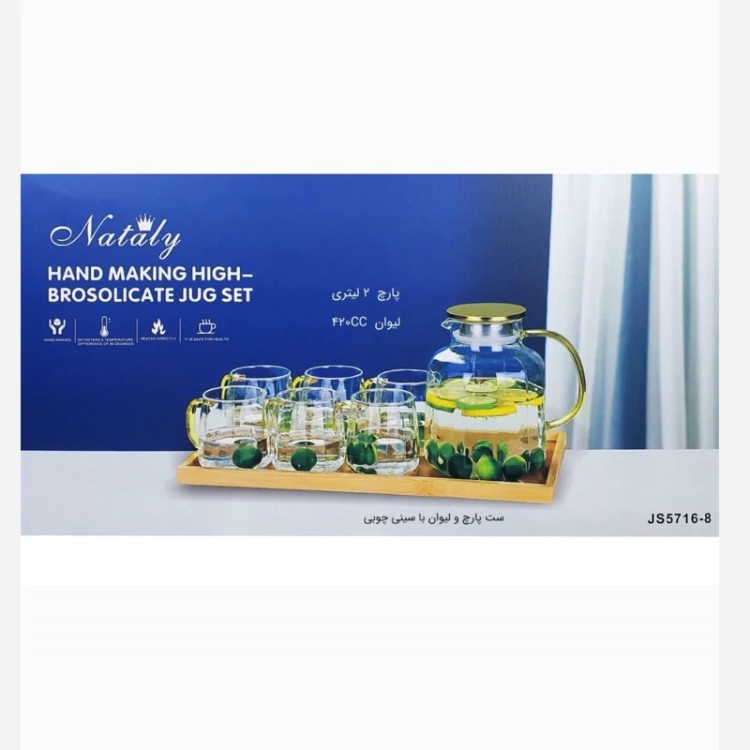 ست پارچ و لیوان پیرکس دسته طلایی ناتالی NATALY با سینی چوبی مدل 8-5716 بسته 8 عددی ارسال رایگان