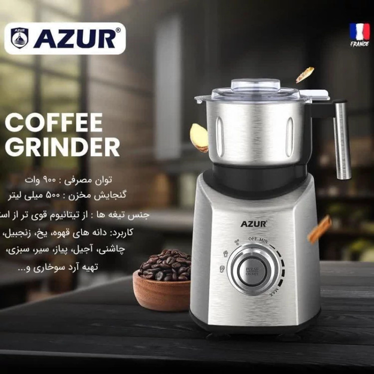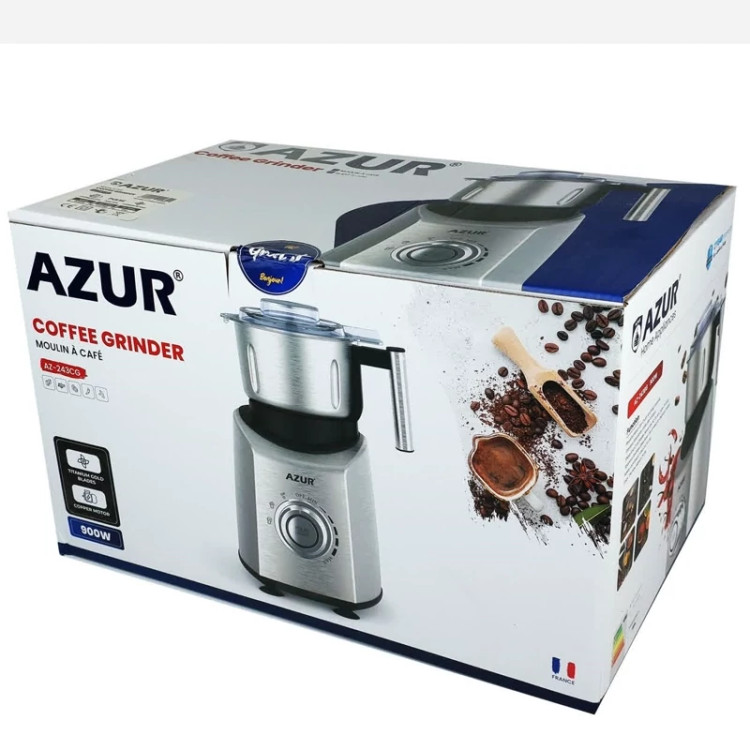 آسیاب قهوه آزور مدل AZ-243CG که مجهز به موتور قدرتمند مسی با توان 900 وات و تیغه هایی از جنس تیتانیوم و بدنه کاملا استیل ضد زنگ است این آسیاب قهوه قابلیت تنظیم قدرت به 5 حالت مختلف را دارد و از عملکرد پالس و یخ شکن برخوردار است