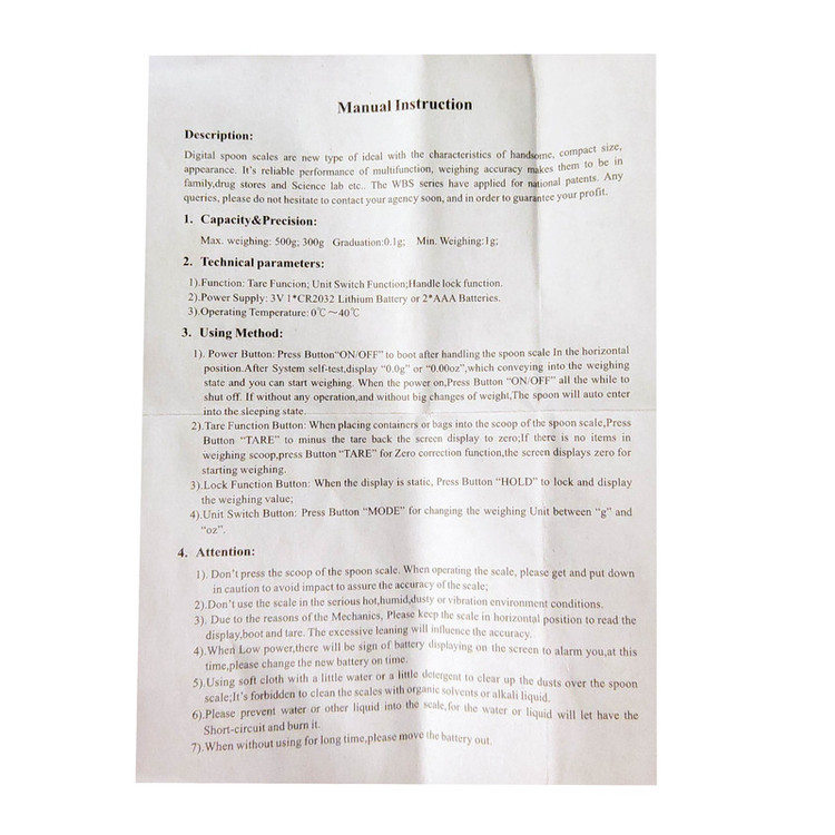حداقل وزن قابل اندازه گیری : 1 گرم حداکثر وزن قابل اندازه گیری: 500 گرم حداکثر دمای قابل تحمل: 40 درجه سانتیگراد واحدهای قابل اندازه گیری : گرم (g) و اونس (oz)