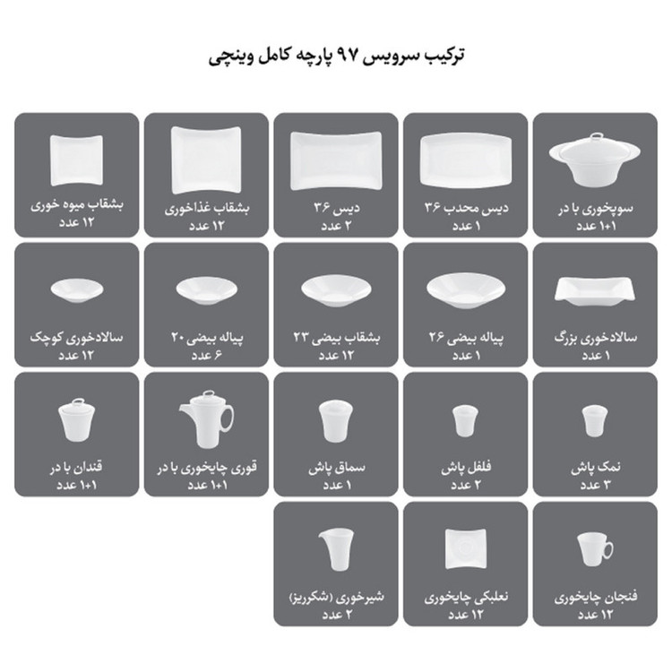 اقلام سرویس: ظرف سالاد , دیس , بشقاب غذاخوری , بشقاب خورشخوری , پیشدستی , پیاله