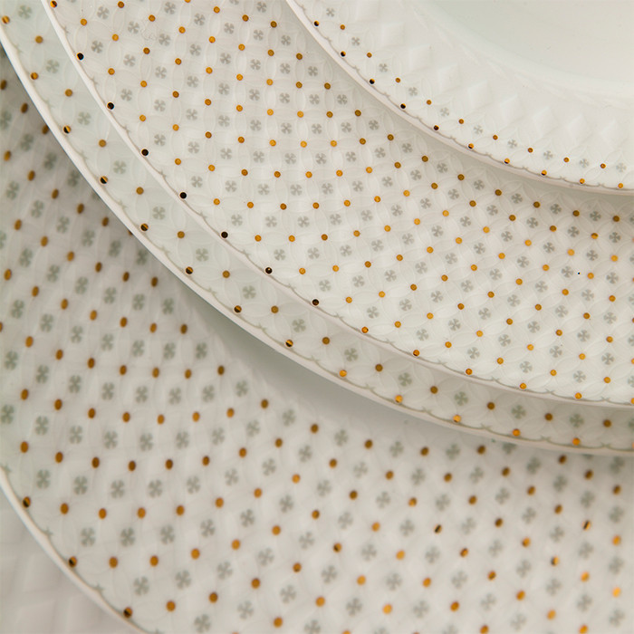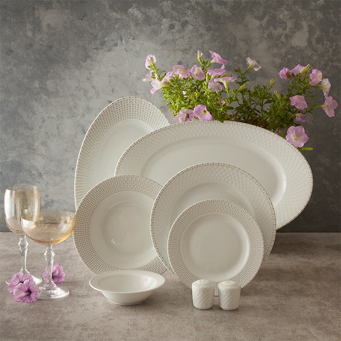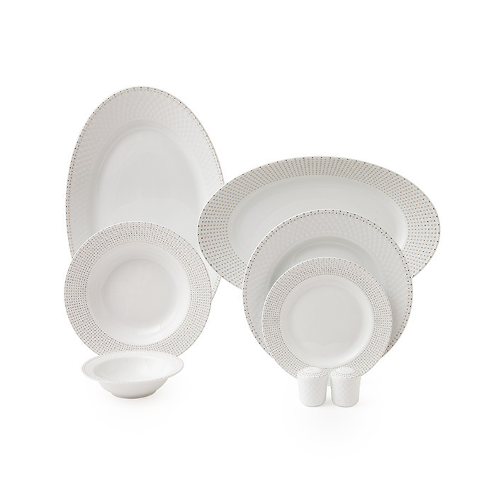 اقلام سرویس: دیس , بشقاب غذاخوری , بشقاب خورشخوری , پیشدستی , نمکپاش و فلفلپاش , پیاله