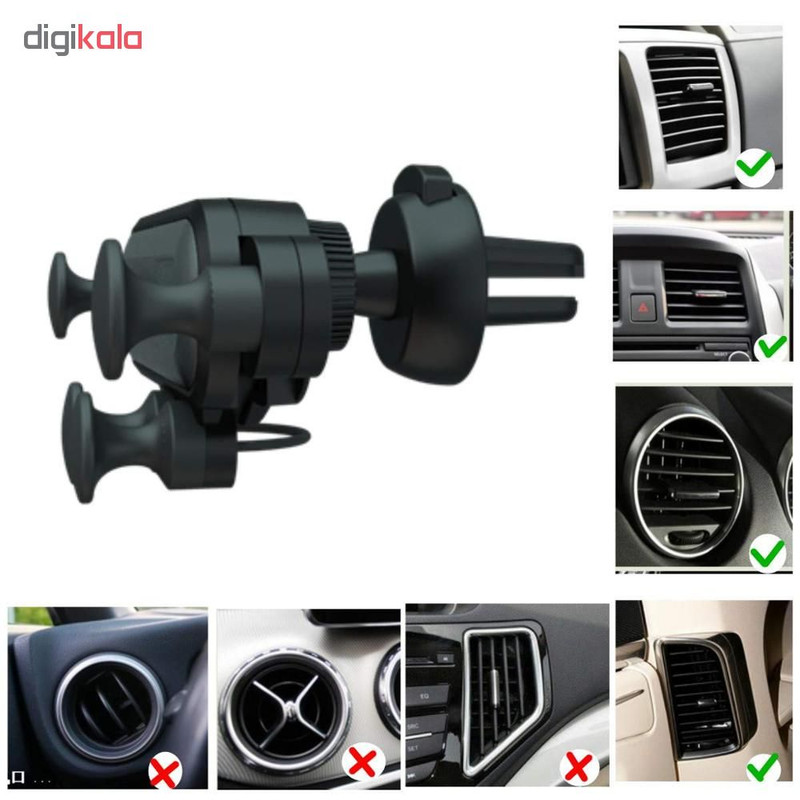 این نگهدارنده موبایل جهت استفاده بصورت نصب بر روی دریچه کولر خودرو می باشد . بوسیله این پایه نگهدارنده موبایل دیگر نیازی به استفاده از دو دست برای قراردادن و برداشتن موبایل از روی پایه نمی باشد . وقتی شما موبایل را بر روی پایه نگهدارنده قرار می دهید بازوهای نگهدارنده موبایل شما را نگه خواهند داشت و برای جدا سازی از پایه فقط کافیست موبایل را بدون وارد کردن فشار به سمت بالا بکشید . شما می توانید موبایل خود را در زاویه های متفاوت بر روی این پایه قرار دهید . این پایه بر روی دریچه هوای برخی از خودرو ها قابل استفاده نمی باشد .