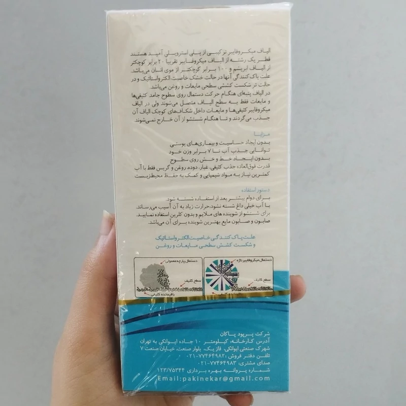دارای خاصیت الکترواستاتیک، بدون نیاز به مواد شوینده - قدرت فوقالعاده جذب کثیفی، غبار، دوده، روغن و گریس فقط با آب - بدون ایجاد حساسیت و بیماریهای پوستی - کمترین نیاز به مواد شیمیایی و کمک به حفظ محیط زیست - توانایی جذب آب تا هفت برابر وزن خود - بدون ایجاد خط و خش روی سطوح