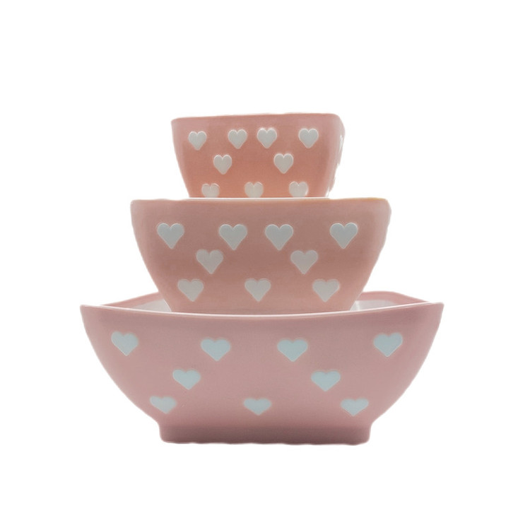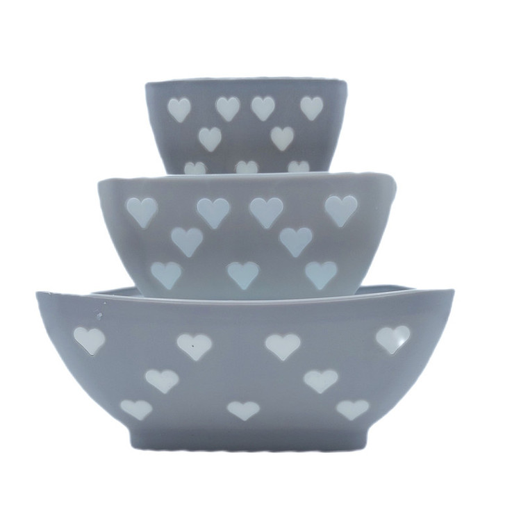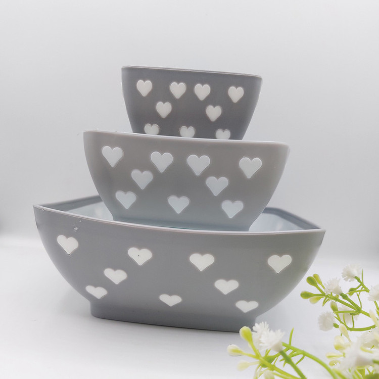 سه عددی کاسه با ظرفیت های به ترتیب 0.85 لیتر و 0.45 لیتر و 0.2 لیتر می باشد و دارای جنس پلاستیک درجه یک و طرح قلبی