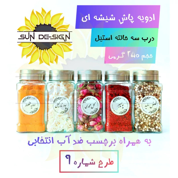 ادویه پاش شیشه ای بلور (درب استیل سه حالته) و برچسب ضدآب انتخابی هدیه