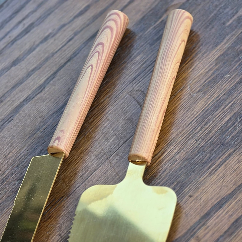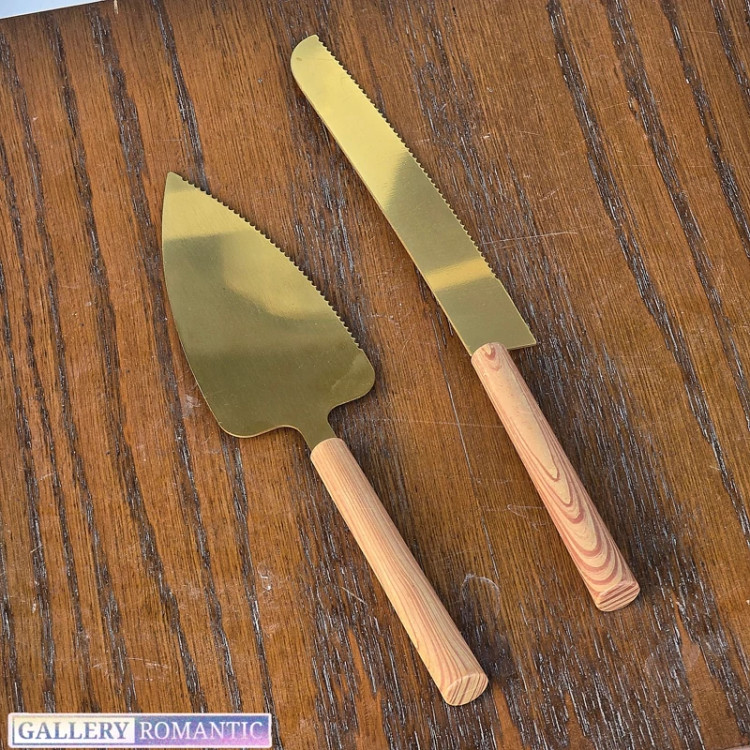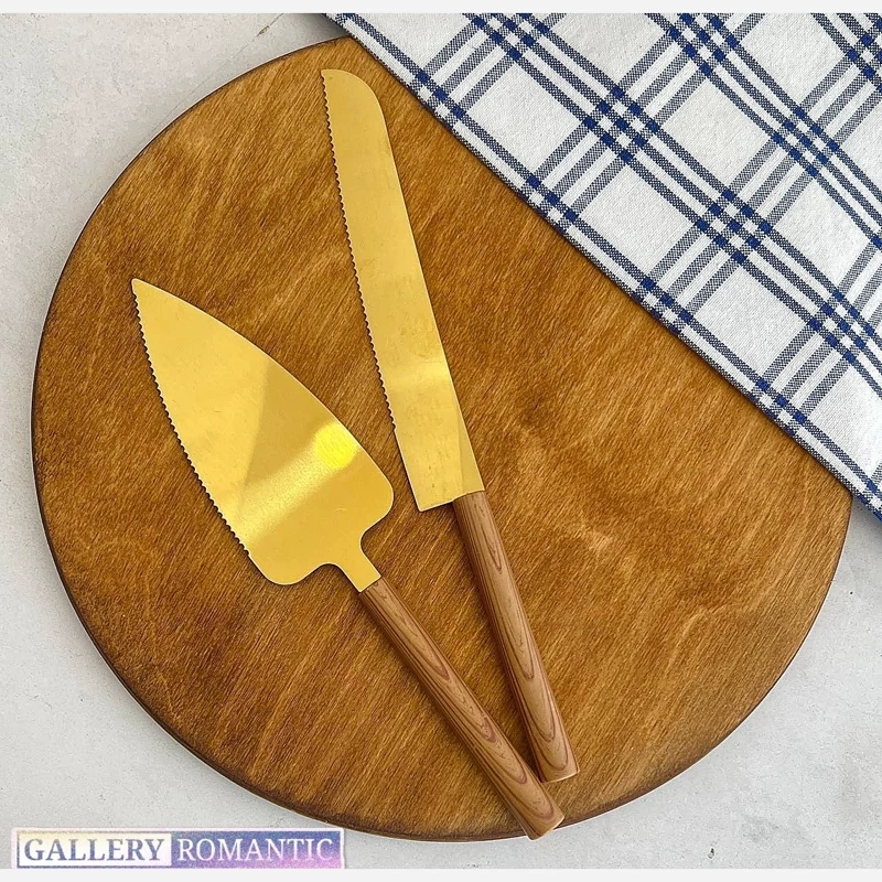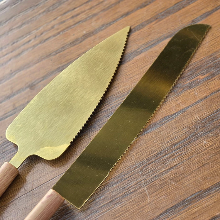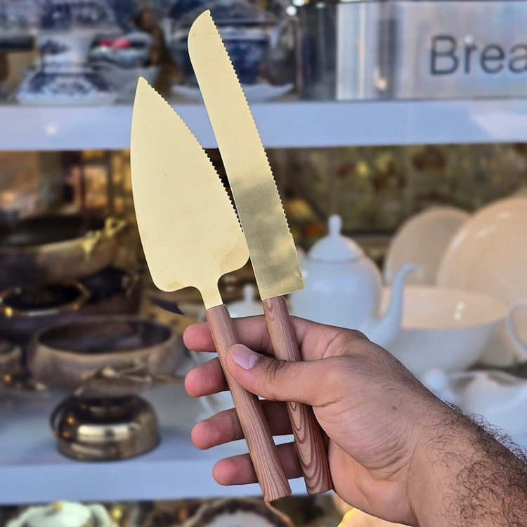 ست کارد و کفگیر کیک استیل طلایی با دسته چوبی کد g282(پس کرایه)