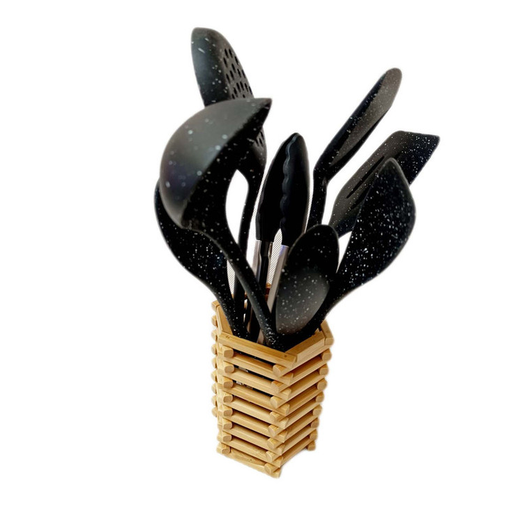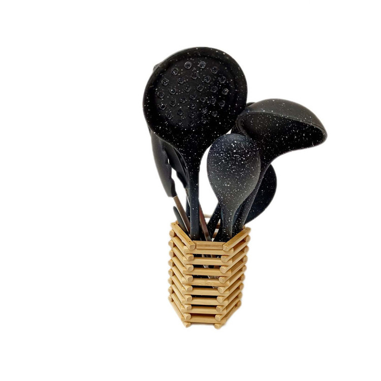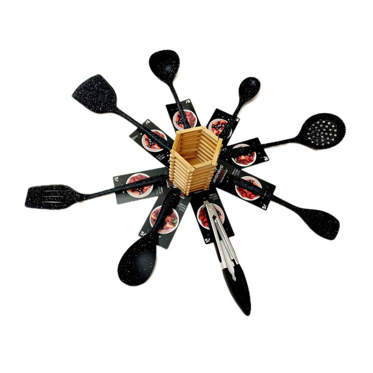 سایر توضیحات: شامل انبر سیلیکون قفل دار, قاشق28.6 و کفگیر ساده 32.9و کفگیر سوراخ دار32.9 و کفگیر شیاردار30.8 ,ملاقه 32.9و کفگیر پارویی دسته کوتاه22.7 و کفگیر لیسکی 28.6 جا قاشقی بامبو