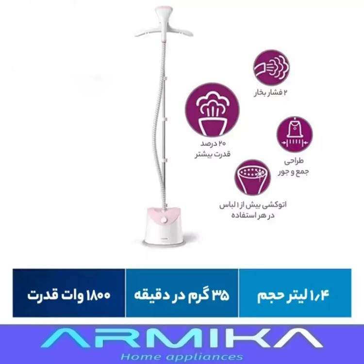 امکان استفاده با آب لوله کشی شهری، امکان تنظیم ارتفاع آویز لباس، پخش عمودی بخار، رسوب زدایی هوشمند، قابلیت پر کردن آب در حین استفاده، مناسب تمام پارچه ها