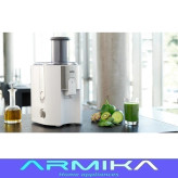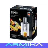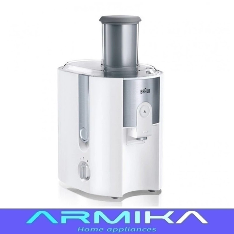 آبمیوهگیری براون مدل «J500» یکی از آبمیوهگیریهای تککاره موجود در بازار است. این دستگاه از بدنهای از جنس پلاستیک بادوام و استیل ساخته شده و استحکام خوبی دربرابر ضربه دارد. قسمت ورودی میوهها در بخش بالایی دستگاه واقع شده است که با قطر زیادی که دارد، میتواند بهآسانی قطعات بزرگ میوه را از خود عبور دهد. این ویژگی کار با دستگاه را آسانتر کرده و به آن سرعت بخشیده است. در طراحی این محصول استوانهای در نظر گرفته شده که پس از قرار دادن میوه بر دهانه ورودی دستگاه میتوان با استفاده از آن میوه را به سمت تیغهها هل داد.