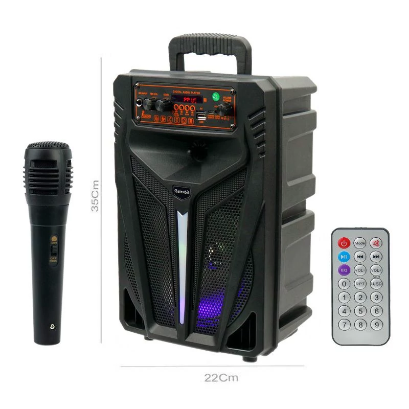پشتیبانی از رادیو FM، بدنه ساخته شده از پلاستیک باکیفیت مرغوب ، دارای نمایشگر LED و نورپردازی داخلی زیبا و کنترل کوچک از راه دور ، میکروفون سیمی تامین انرژی اسپیکر توسط باتری لیتیوم یونی داخلی با میزان شارژدهی 3 ساعت و ظرفیت باتری 1800 میلی آمپر ساعت و توان خروجی کلی 10 وات مجهز به کلید های فیزیکی جهت مدیریت موسیقی و صدا و همچنین جهت کم و زیاد کردن ولوم میکروفون و اکو و خاموش و روشن کردن دستگاه و … پشتیبانی از فلش مموری، اتصال با سیم از طریق رابط جک 3٫5 میلی متری صدا و اتصال بی سیم از بلوتوث نسخه 5 با برد 10 متر دارای درایو به قطر 8 اینچ با برد کامل، ورودی میکروفن برای اتصال میکروفن و همخوانی (حالت کارائوکه) با آهنگ در حال پخش