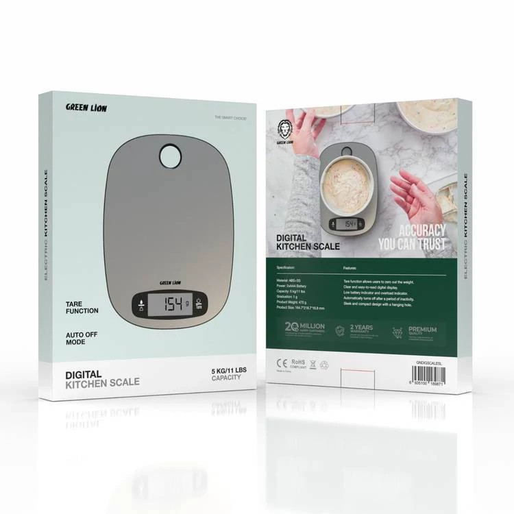 ترازوی دیجیتال آشپزخانه گرین لیون برای پخت و پز دقیق و پخت عالی است. این ترازو با طراحی مدرن و کوچک خود هم جذاب است و هم در فضا صرفه جویی می کند و آن را به یک مکمل عالی برای هر آشپزخانه ای تبدیل می کند. دارای درجه بندی 1 گرم و محدودیت 5 کیلوگرمی (11 پوند) است که اندازه گیری های دقیقی را برای همه چیز فراهم می کند. صفحه نمایش دیجیتال روشن به راحتی قابل خواندن است و ویژگی تاره به شما امکان می دهد به سرعت چندین ماده را در یک ظرف اندازه گیری کنید. این ترازو توسط دو باتری قلمی تغذیه می شود و برای راحتی کار دارای هشدار کم بودن باتری و اضافه بار است. با حالت خاموش شدن خودکار در مصرف انرژی صرفه جویی می کند و دارای یک سوراخ آویز برای ذخیره سازی است. ترازو آشپزخانه دیجیتال گرین لیون برای آشپزها و نانوایان خانگی که به دقت و کارایی اهمیت می دهند عالی است.