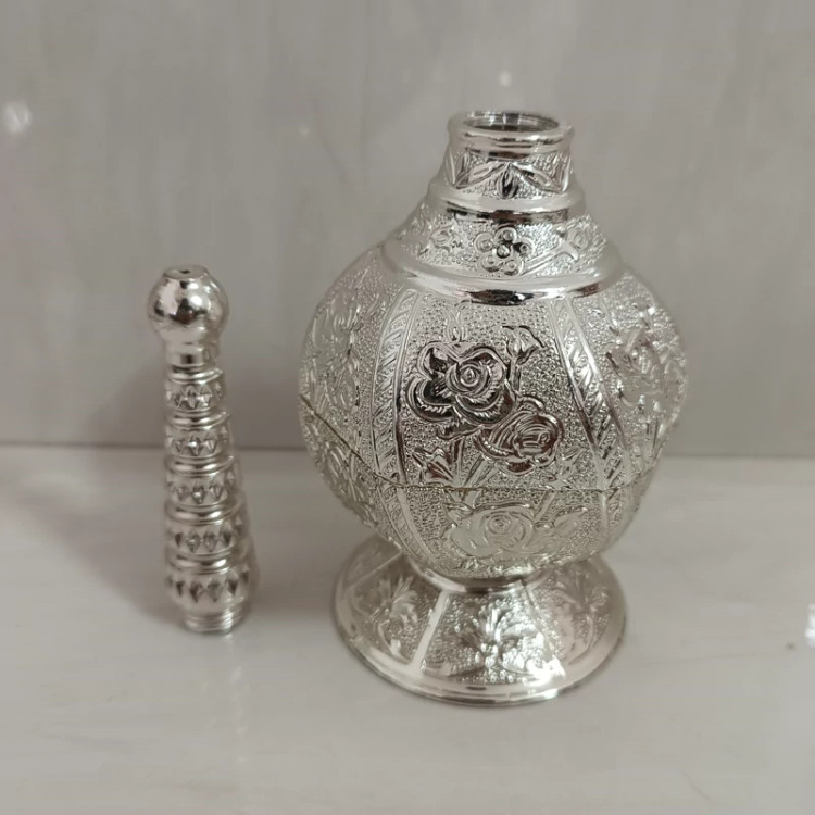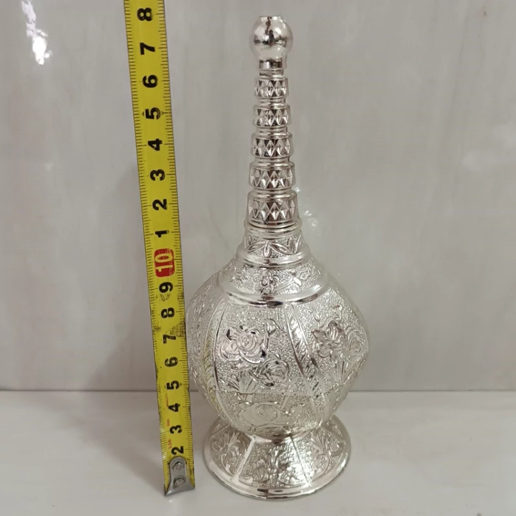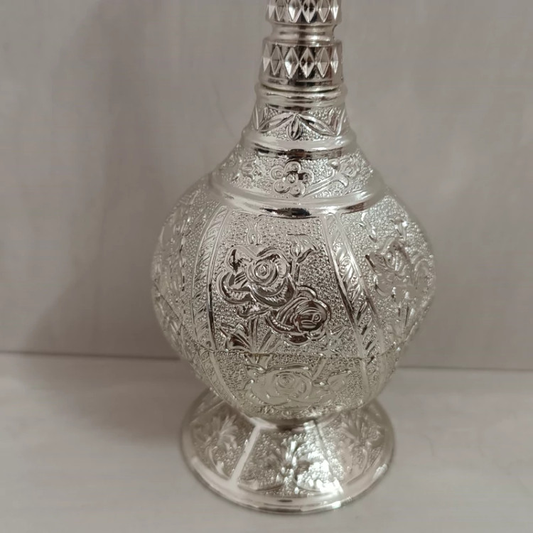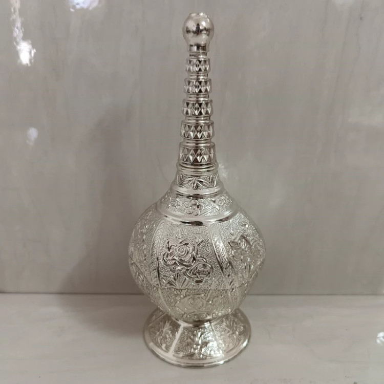 این ظرف از جنس پیوتر است و نقره ای رنگ میباشد و به صورت نانو شده است و مخصوص گلاب پاش هست و درب آن به صورت پیچی میباشد