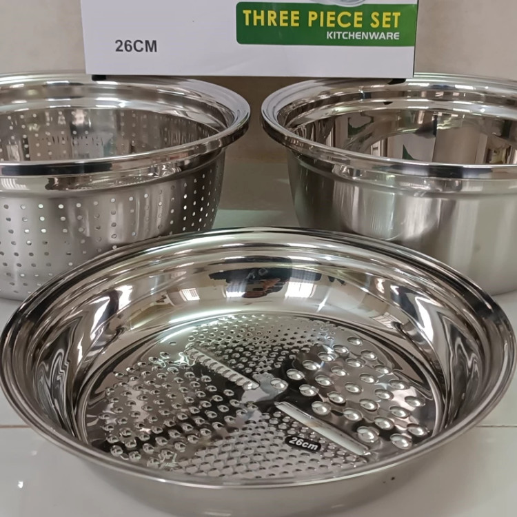 هر سه کالا در سایز 26 سانتی متر تولید شده و از جنس استیل ضد زنگ هستند. که مقاومت و در عین حال کیفیت بسیار بالایی را دارند. ویژگی اصلی آبکش و لگن استیل رنده دار، قابلیت قرارگیری هر سه ظرف درون هم می باشد. بنابراین در هنگام استفاده نیاز به ظرف دیگری پیدا نمی کنید در صورت لزوم می توانید رنده را بر روی لگن و یا آبکش قرار دهید .