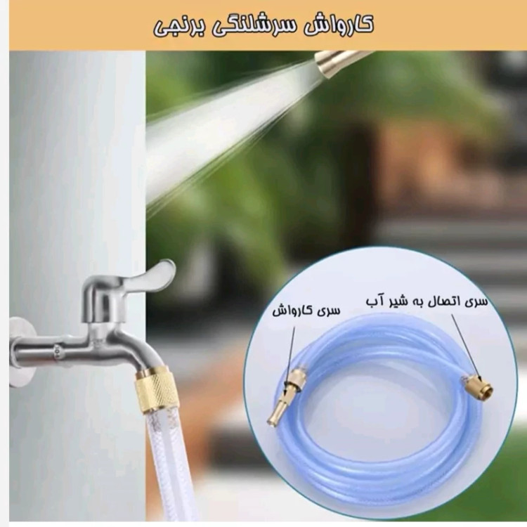 دارای واشرهای لاستیکی برای جلوگیری از نشت آب حاوی یک سری برنجی متصل به شیر و یک نازل کارواشی قابلیت تنظیم دامنه پاشش و جریان آب فقط با پیچاندن بدنه نازل