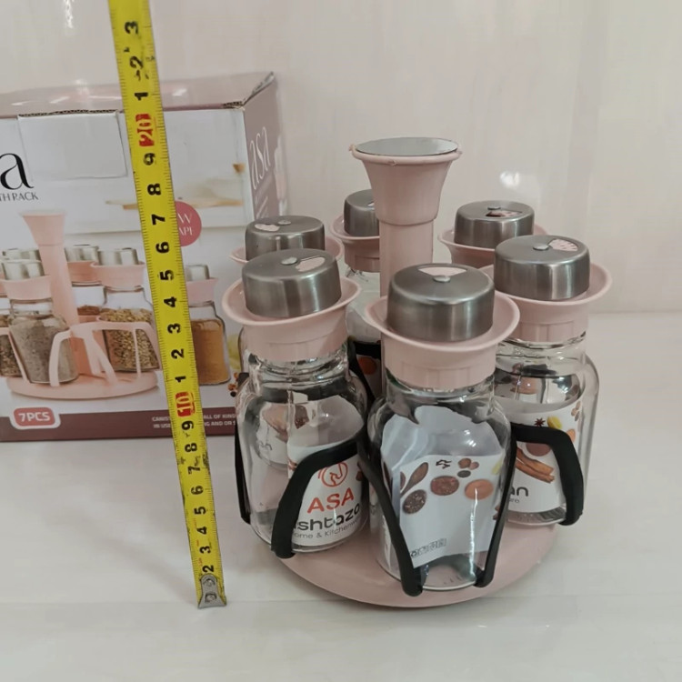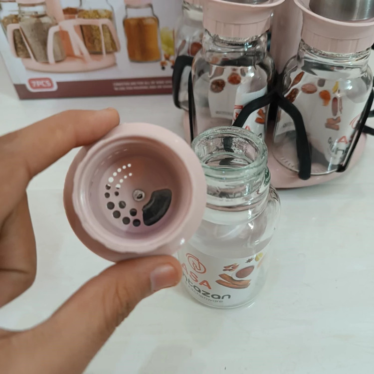 ست جا ادویه 7 پارچه گردان شیشه ای رنگ صورتی ـ سرویس ادویه پاش ـ جاادویه ـ ست جا ادویه - نمک پاش