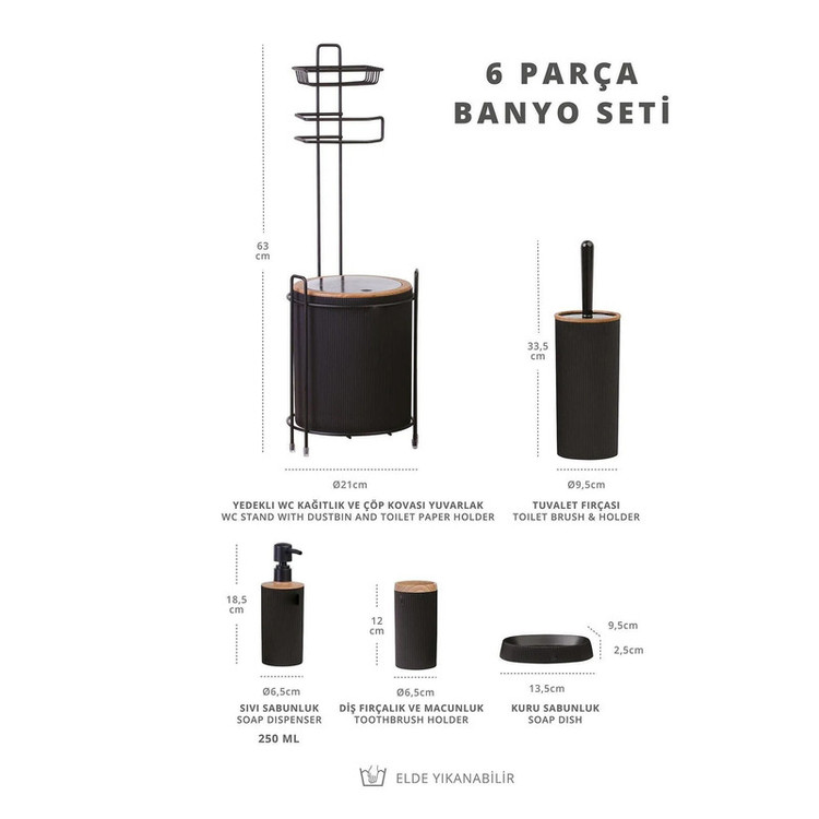 استند جا دستمالی : 63x21 فرچه دستشویی : 9.5x35.5 جا مسواکی : 6.5x12 جاصابونی : 9.5x2.5x13.5 مخزن مایع دستشویی : 6.5x18.5