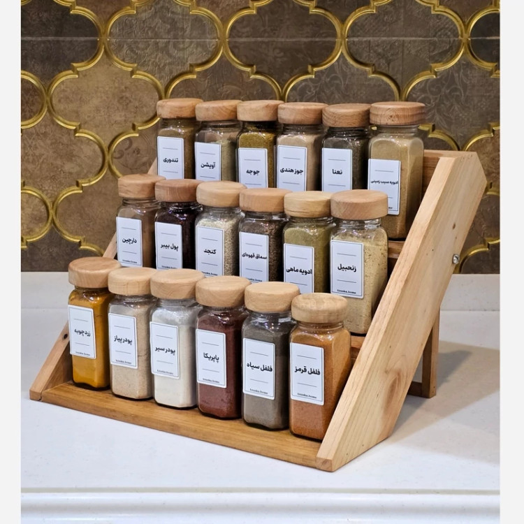 پک 18تایی جا ادویه ای با استند رونیکا چوب ترک توسکا (18 عدد شیشه 12سانت با در چوبی،18عدد لیبل،18عدد عدد نمکپاش)/ کارون