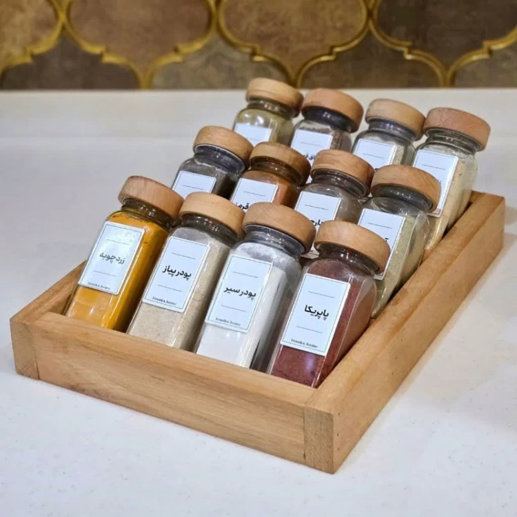 پک استند راینا همراه 12 عدد جاادویه با درب چوبی ترک و لیبل ضد اب و سر نمکپاش توسکا/ کارون