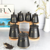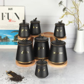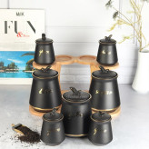 این ست جاادویه و بانکه 7 پارچه با طراحی مینیمال و رنگ مشکی، انتخابی ایدهآل برای کسانی است که عاشق سادگی شیک و چیدمان مرتب هستند. پایههای چوبی طبیعی، ترکیب رنگ خنثی، و نوشتههای مینیمالی، ظاهری خاص و متفاوت به آشپزخانه شما میدهند.