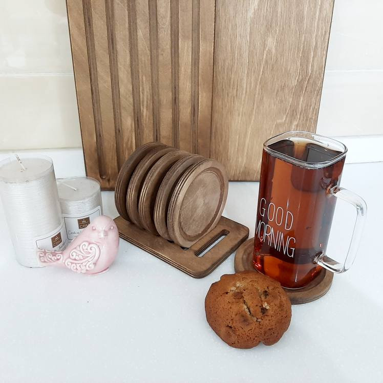 سایر توضیحات: این محصول زیبا از چوب بادوام، باکیفیت و ضد آب پلایوود روس تهیه شده و شامل یک پایه و 6 عدد زیرلیوانی میباشد.