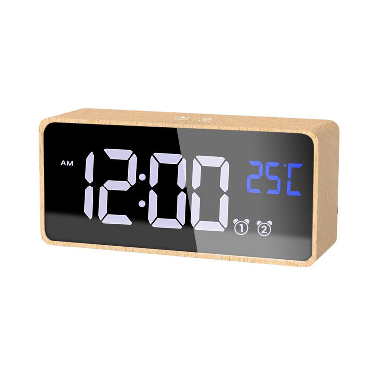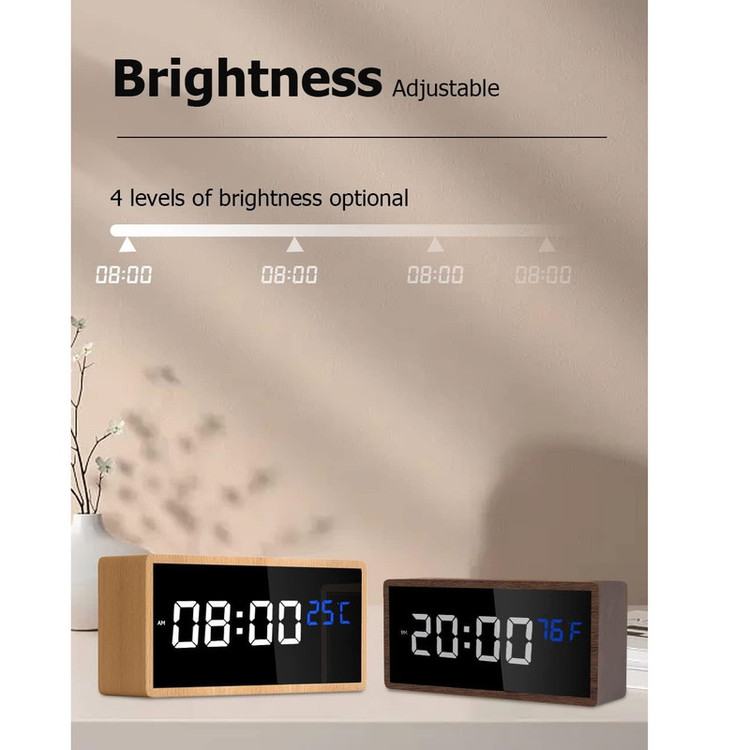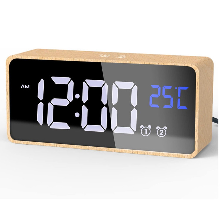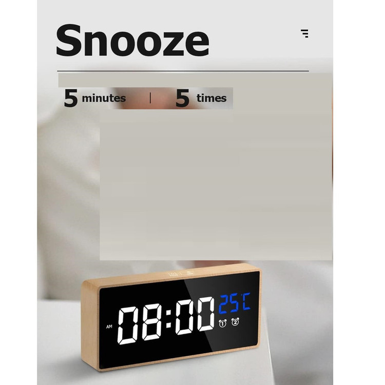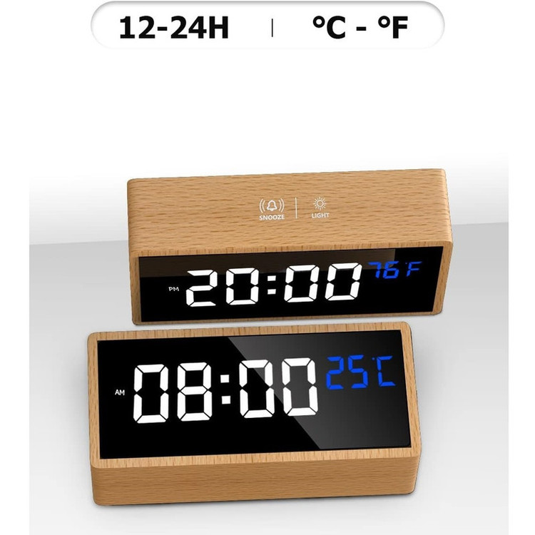 ساعت زنگ دار چوبی، نمایشگر LED، 2 زنگ هشدار، منبع تغذیه USB-C، باتری پشتیبان داخلی، زمان تعویق 5 دقیقه، ساعت زنگ دار دیجیتال
