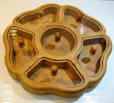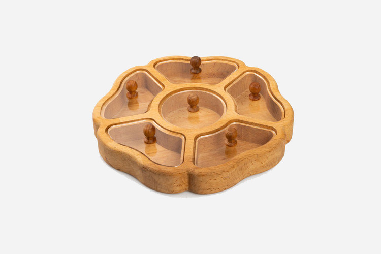 این تصویر، یک اردو خوری چوبی گردان با شش ظرف سرامیکی کوچک و یک ظرف بزرگتر در مرکز آن را نشان میدهد. جنس این اردو خوری از چوب راش با رنگ روشن و بافت طبیعی است که زیبایی و گرمای خاصی به آن بخشیده است. ظرفهای سرامیکی به رنگ سفید هستند و هماهنگی زیبایی با چوب دارند.
