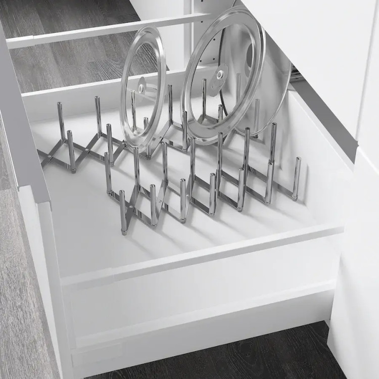 منظم کردن در های قابلمه ها و تابه ها همیشه یک مشکل اساسی در آشپزخانه است. جای در قابلمه ایکیا IKEA-VARIERA یک ابزار خاص و کاربردی است. این ابزار کاملا از استیل ضد زنگ ساخته شده و قابلیت تغییر سایز دارد.. بنابر این میتوانید در هر جایی از آن استفاده کنید. حداقل امکتن قرار دادن 6 درب قابلمه روی آن وجود دارد.