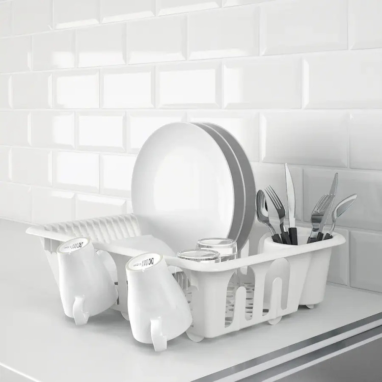 آبچکان سفید ایکیا IKEA-FLUNDRA از جنس پلاستیک است. این جا ظرفی فضای کمی اشغال میکند و ظرفیت بالایی برای قرار دادن ظروف شسته شده دارد. میتوانید تا 9 عدد لیوان را در دیواره آن قرار دهید. فضای داخلی آن فضای مناسبی برای نگهداری بشقاب ها است و یک بخش مخصوص برای قراردادن قاشق و چنگال هم دارد.